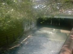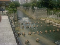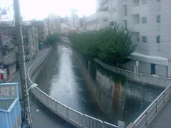 山手通りと並行して流れる目黒川は水の色も変化する。