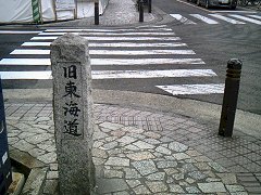 川崎駅を降り、新川通りの小土呂橋交差点から旧東海道へ左折。 (反対交差点側に小土呂橋の碑) ▼ |