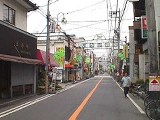 この商店街の突き当たりが国道15号線だった。斜め先に青いガードが見えた。あれが