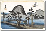 ・・・・・・広重の平塚宿は高麗山を背景に描き、中央に縄手道すなわち田の間の道(あぜ道)を走りくる飛脚と